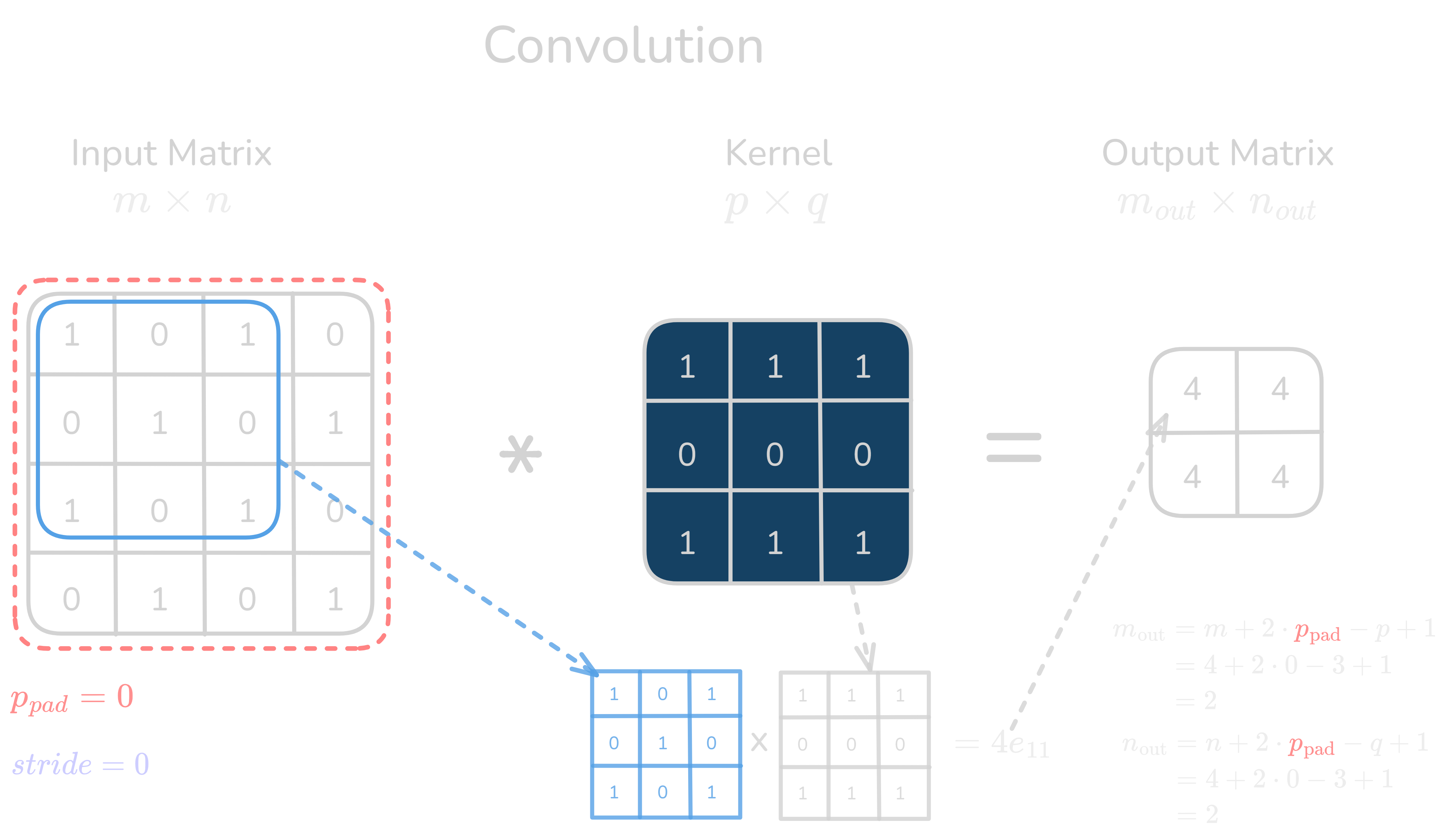 \[\text{Output}(i, j) = \sum_{\text{each element in the kernel}} \left( \text{Input}(i+k, j+l) \times \text{Kernel}(k, l) \right)\]Example with Matrix Convolution (including padding and stride):