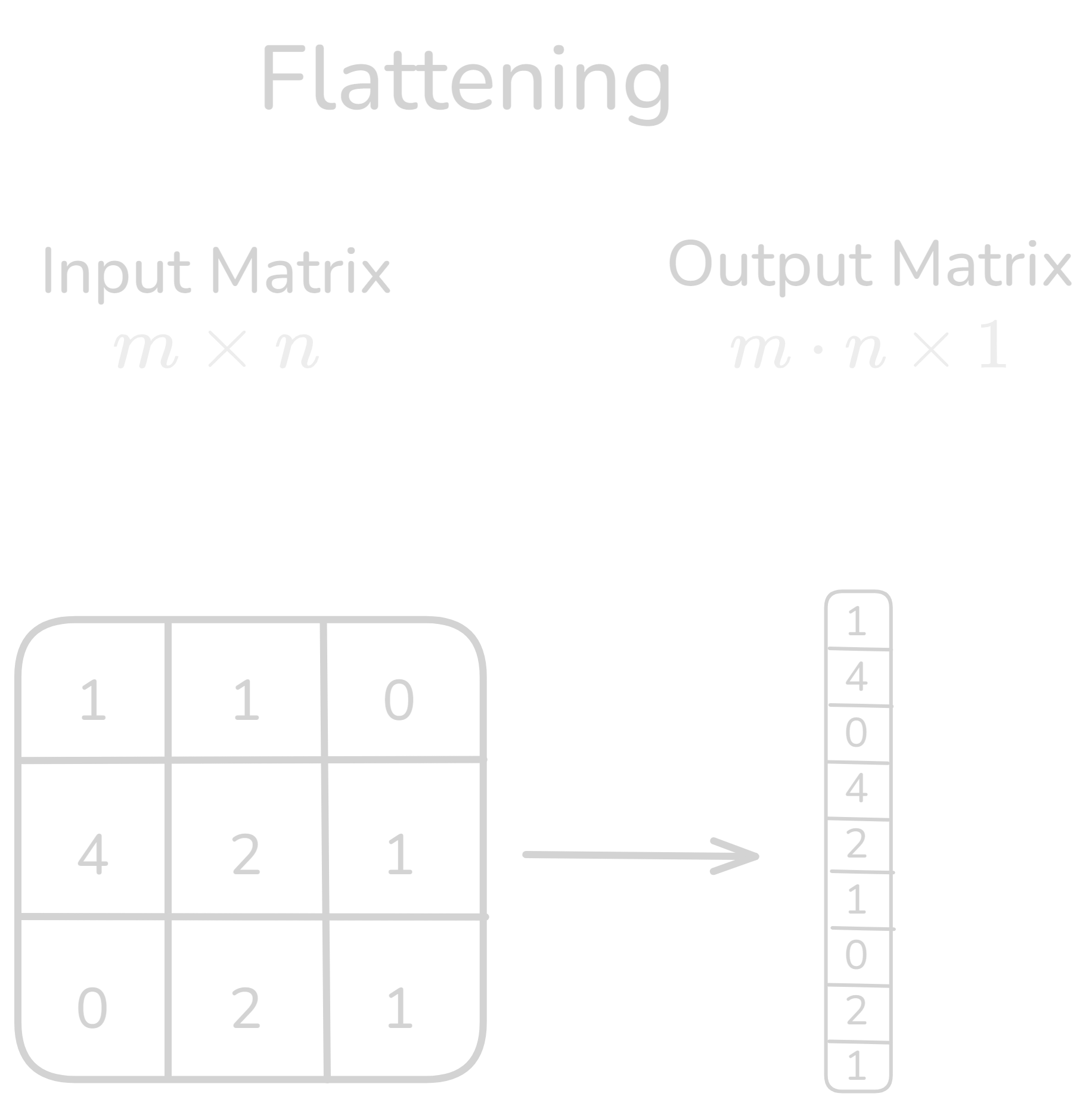 Flattening converts the tensor into a vector of size \((N, C \times H \times W)\). The general formula for flattening is simply: