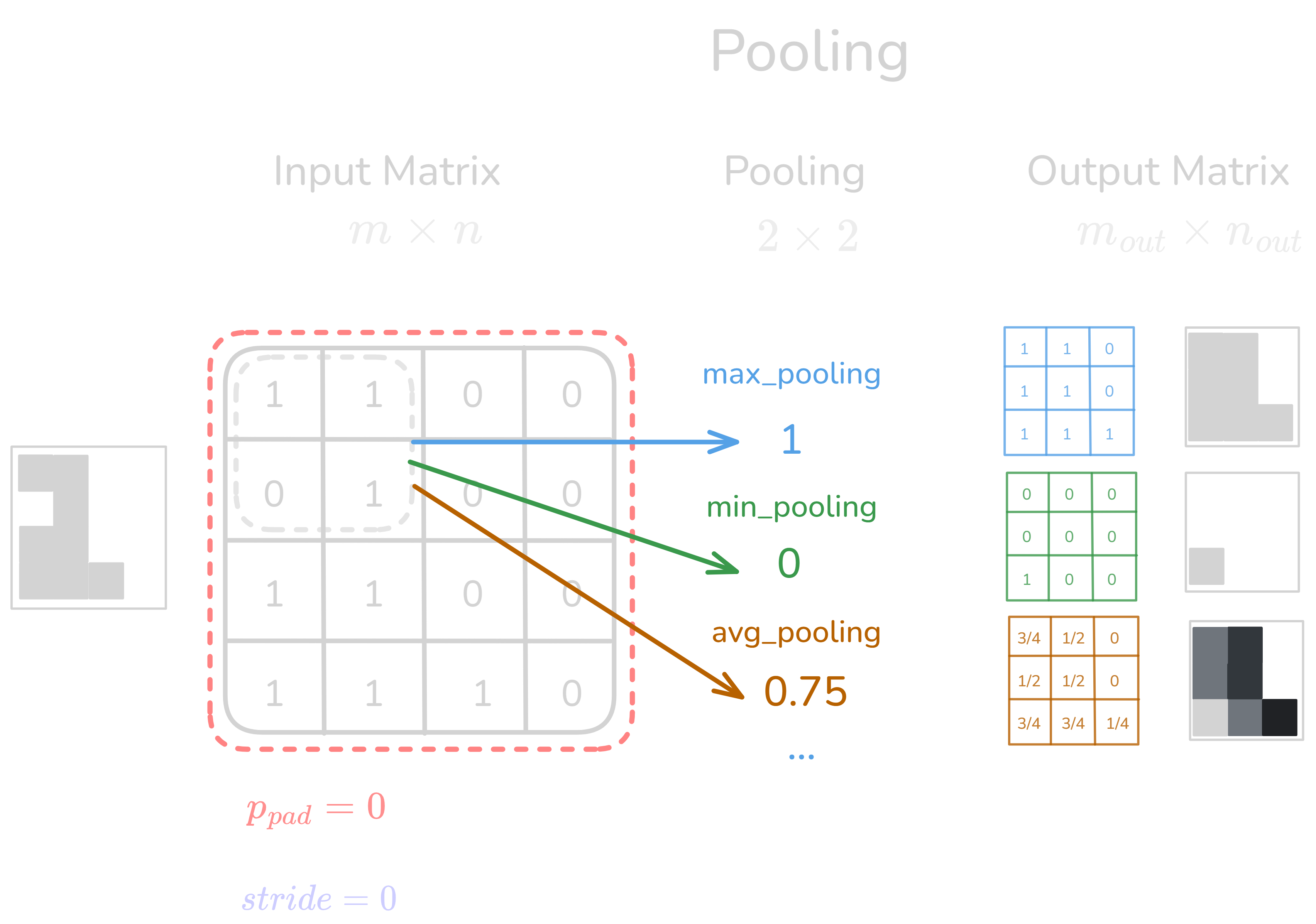 Pooling is generally performed over a window (or filter) of size \(k \times k\) across the input tensor. Given an input feature map \(S\) of size \(H \times W\) (height × width), pooling with filter size \(k \times k\), stride \(s\), and padding \(p\) can be described by the following general function: