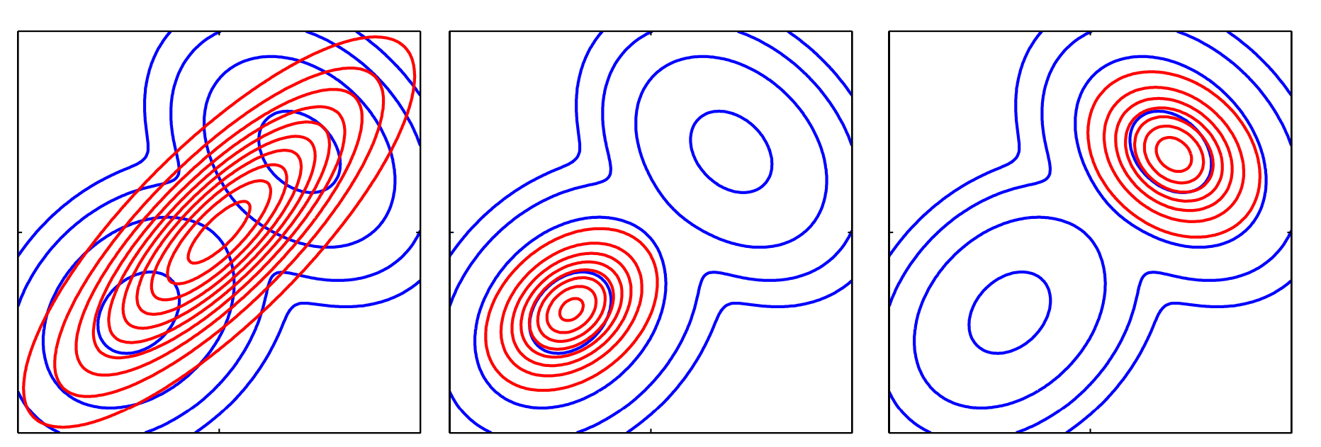Figure 3.0: KL divergence fitting a simple distribution (red) to a complex one (blue). Left: identical distributions, $D{\text{KL}} = 0$. Centre and right: as the approximation concentrates on different modes, divergence increases. source_