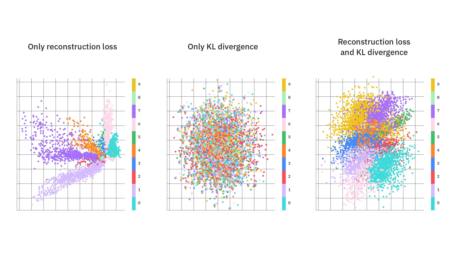 Figure 3.1: MNIST latent spaces trained with reconstruction loss only, KL divergence only, and both combined (ELBO). Only the combination produces a space that is both structured and complete. source