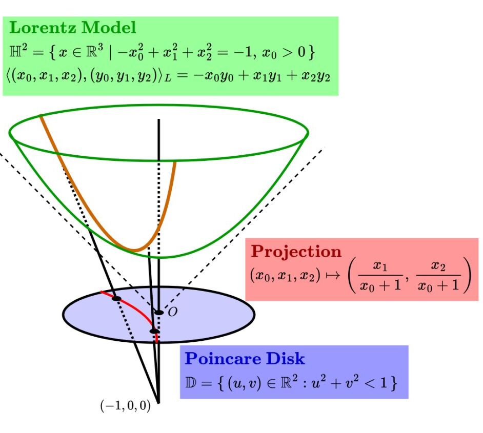\[\mathbb{H}^2 = \{ x \in \mathbb{R}^3 \mid -x_0^2 + x_1^2 + x_2^2 = -1,\; x_0 > 0 \}\]with inner product $\langle x, y \rangle_L = -x_0 y_0 + x_1 y_1 + x_2 y_2$. The Poincaré disk $\mathbb{D} = {(u,v) \in \mathbb{R}^2 : u^2 + v^2 < 1}$ is obtained by projecting the hyperboloid onto the unit disk. Points near the boundary of the disk are exponentially far from the center in hyperbolic distance — which is why hierarchical trees can be embedded with siblings close together and the root near the center, using very few dimensions.