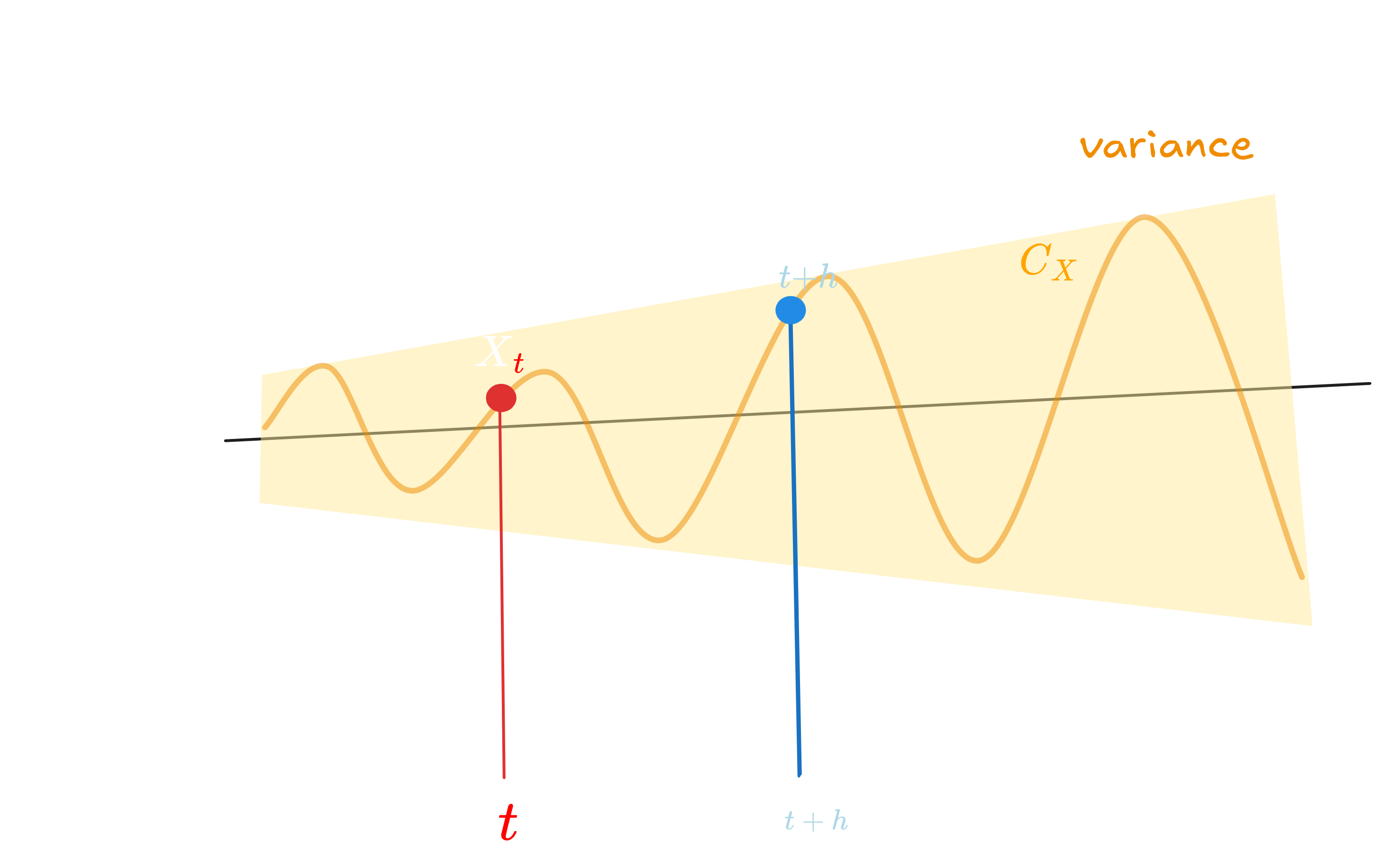 - $\text{Cov}(X_t, X_{t+h}) = \gamma(h)$ depends only on lag $h$, not on $t$