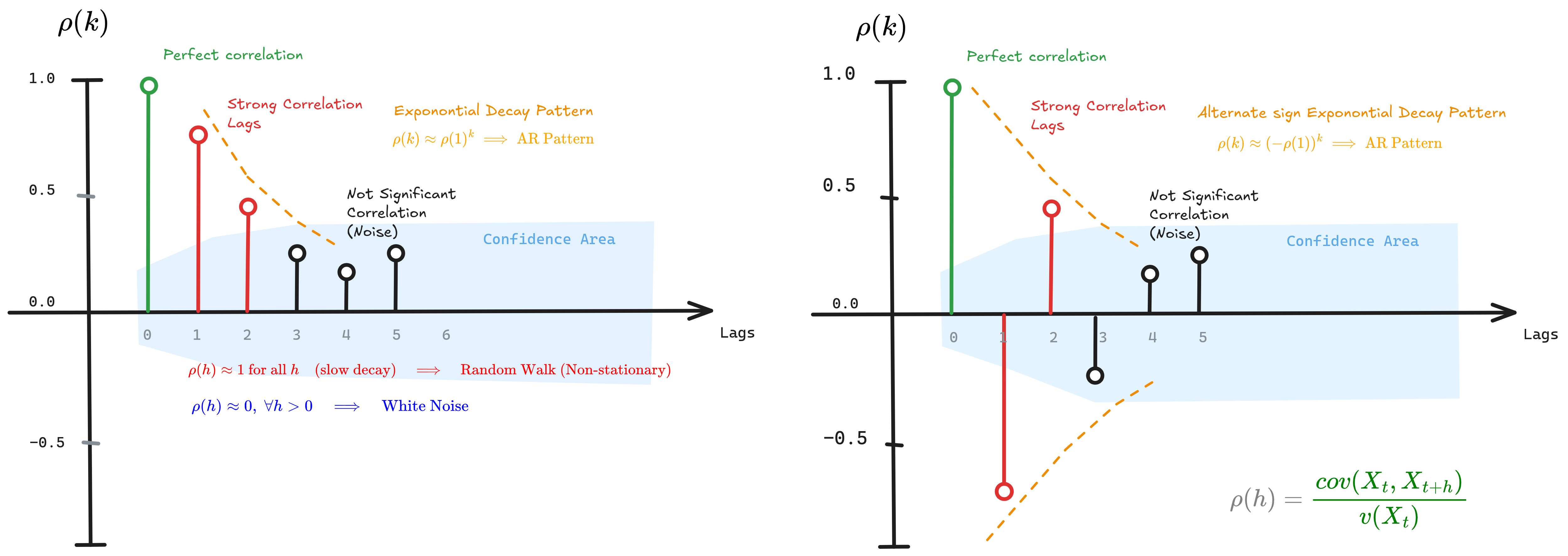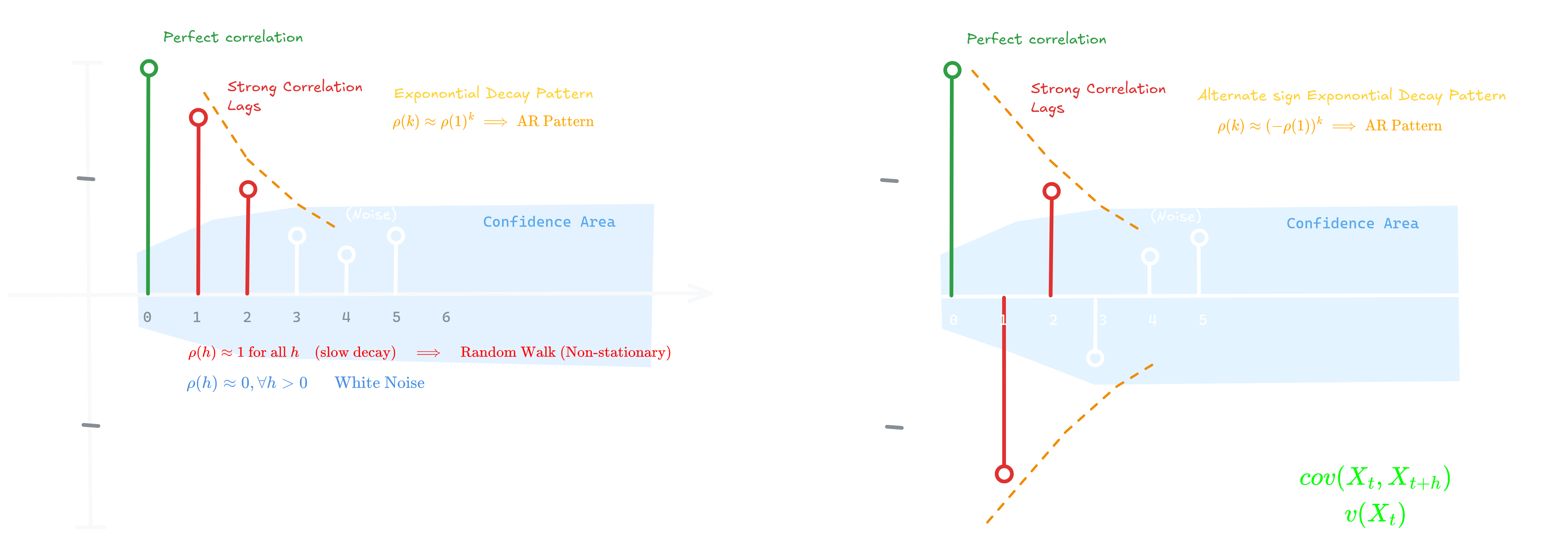 Figure 2.1: ACF plots showing exponential decay patterns, confidence bounds, and interpretation for AR processes, random walks, and white noise