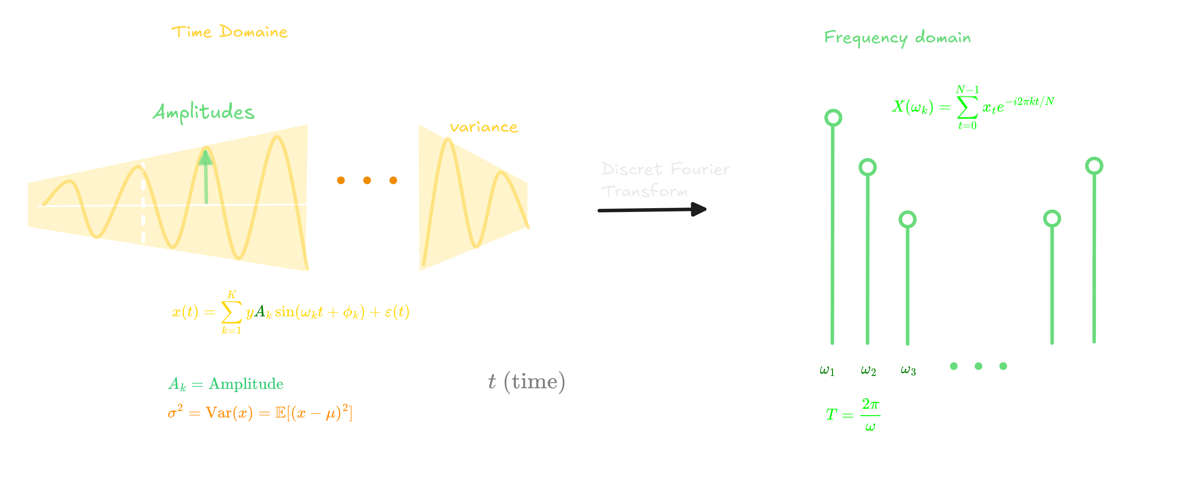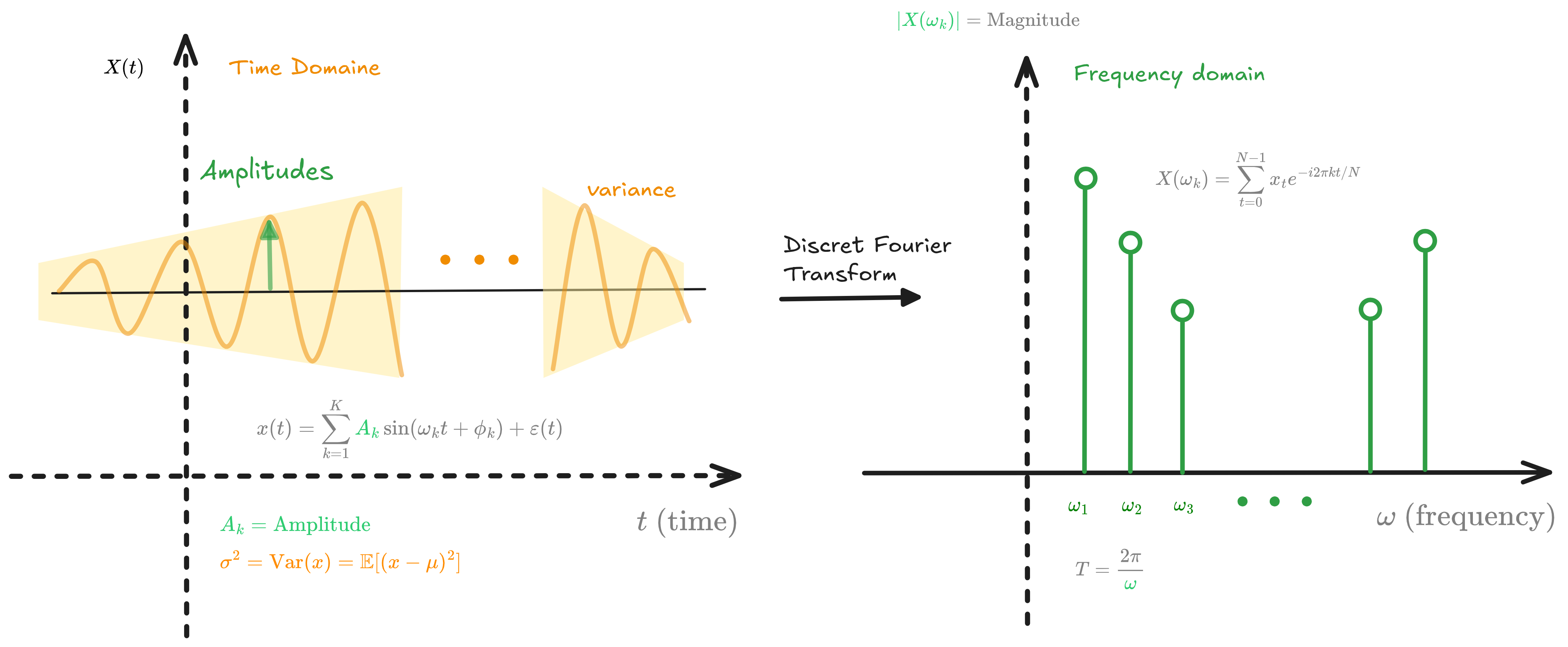 \[X(\omega_k) = \sum_{t=0}^{N-1} x_t e^{-i2\pi k t/N}, \quad k = 0, 1, \ldots, N-1\]where $\omega_k = 2\pi k/N$ is the frequency and $i = \sqrt{-1}$. Each frequency $\omega_k$ reveals how much a particular cycle contributes to the overall signal.