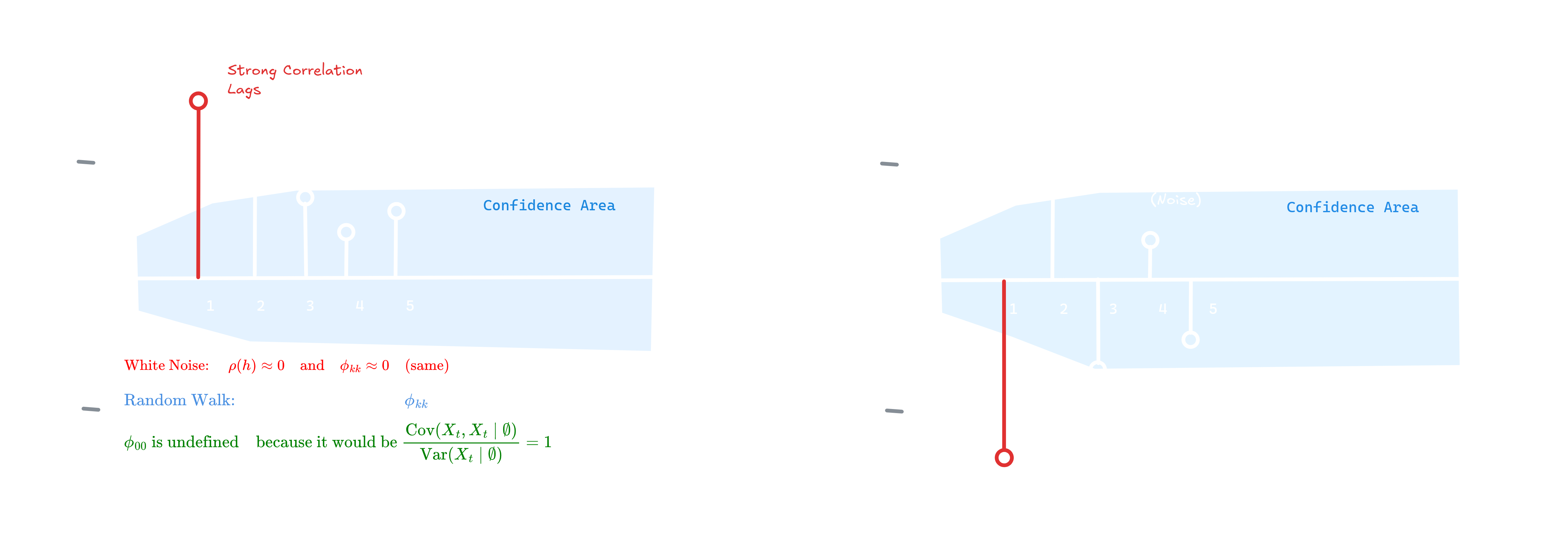 Figure 2.2: PACF plots showing sharp cutoffs for AR processes, with comparison between white noise and random walk behavior