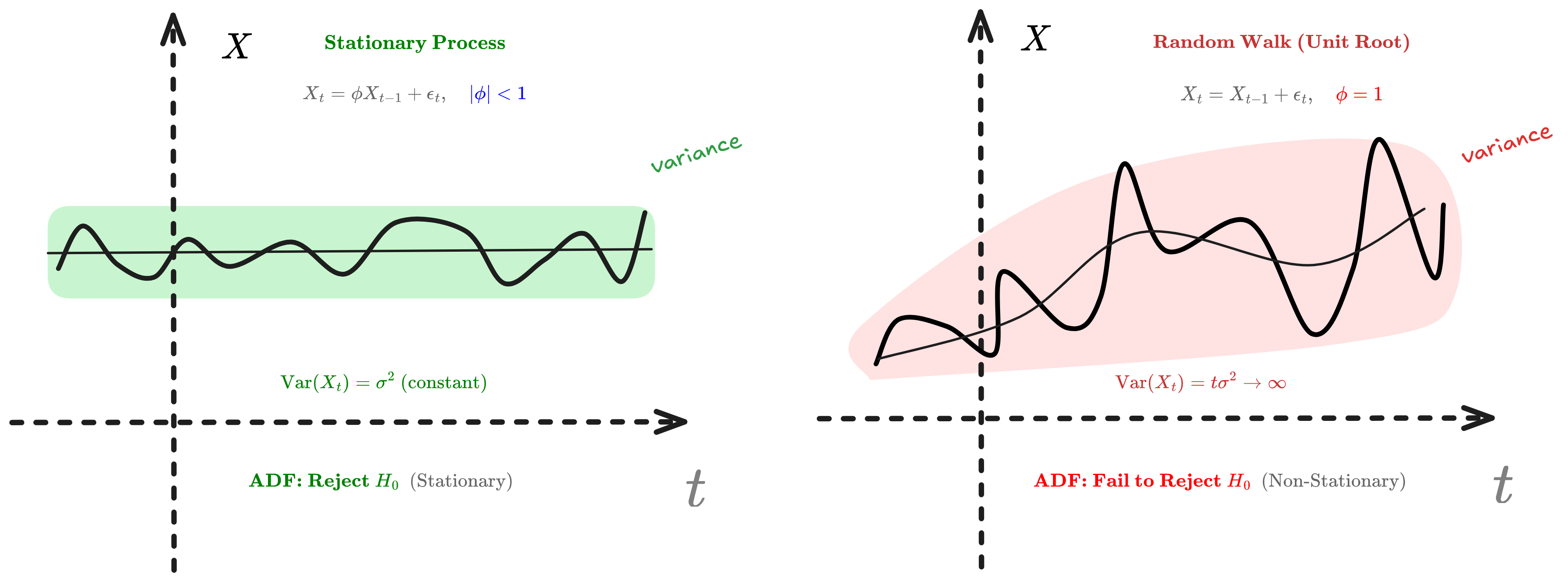 However, the first difference $\nabla X_t = X_t - X_{t-1} = \epsilon_t$ is stationary. This demonstrates why differencing works: it transforms integrated processes $I(d)$ into stationary ones.