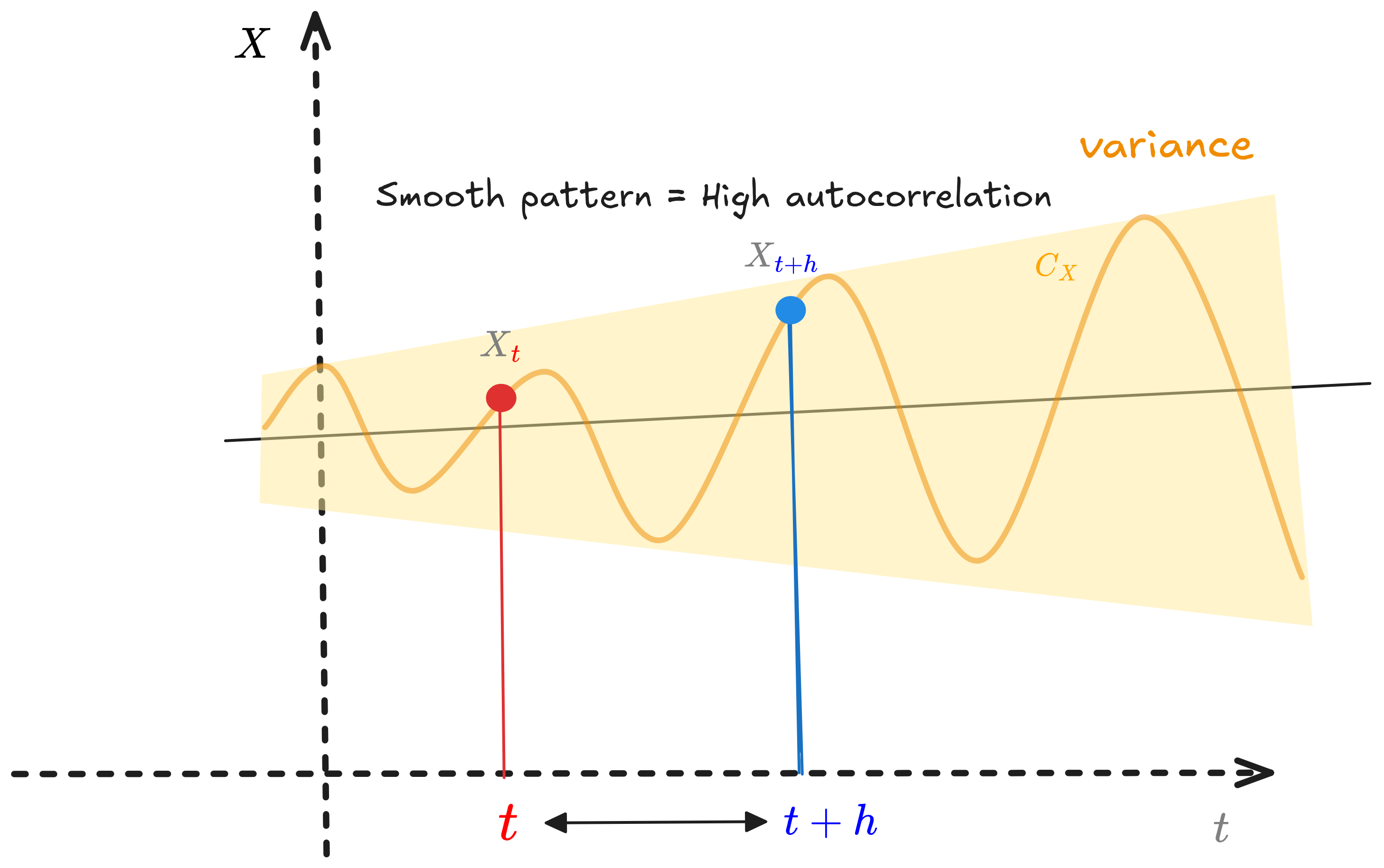 \[\rho(h) = \frac{\gamma(h)}{\gamma(0)} = \frac{\text{Cov}(X_t, X_{t+h})}{\text{Var}(X_t)}\]where $\gamma(h) = \text{Cov}(X_t, X_{t+h})$ is the autocovariance at lag $h$, and $\gamma(0) = \text{Var}(X_t)$ normalizes the measure to the range $[-1, 1]$.