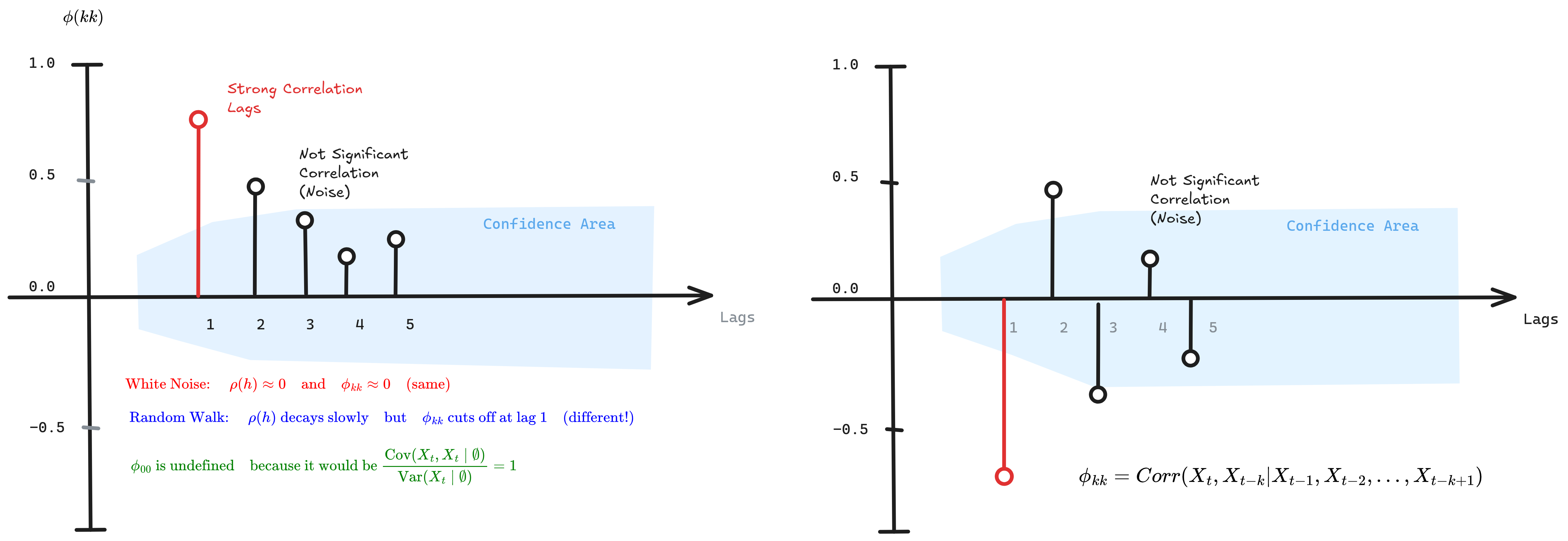 Partial autocorrelation $\phi_{hh}$ measures correlation between $X_t$ and $X_{t+h}$ after removing the linear dependence on intermediate lags $X_{t+1}, \ldots, X_{t+h-1}$. This isolates the unique, direct contribution of lag $h$ beyond what’s already explained by shorter lags.